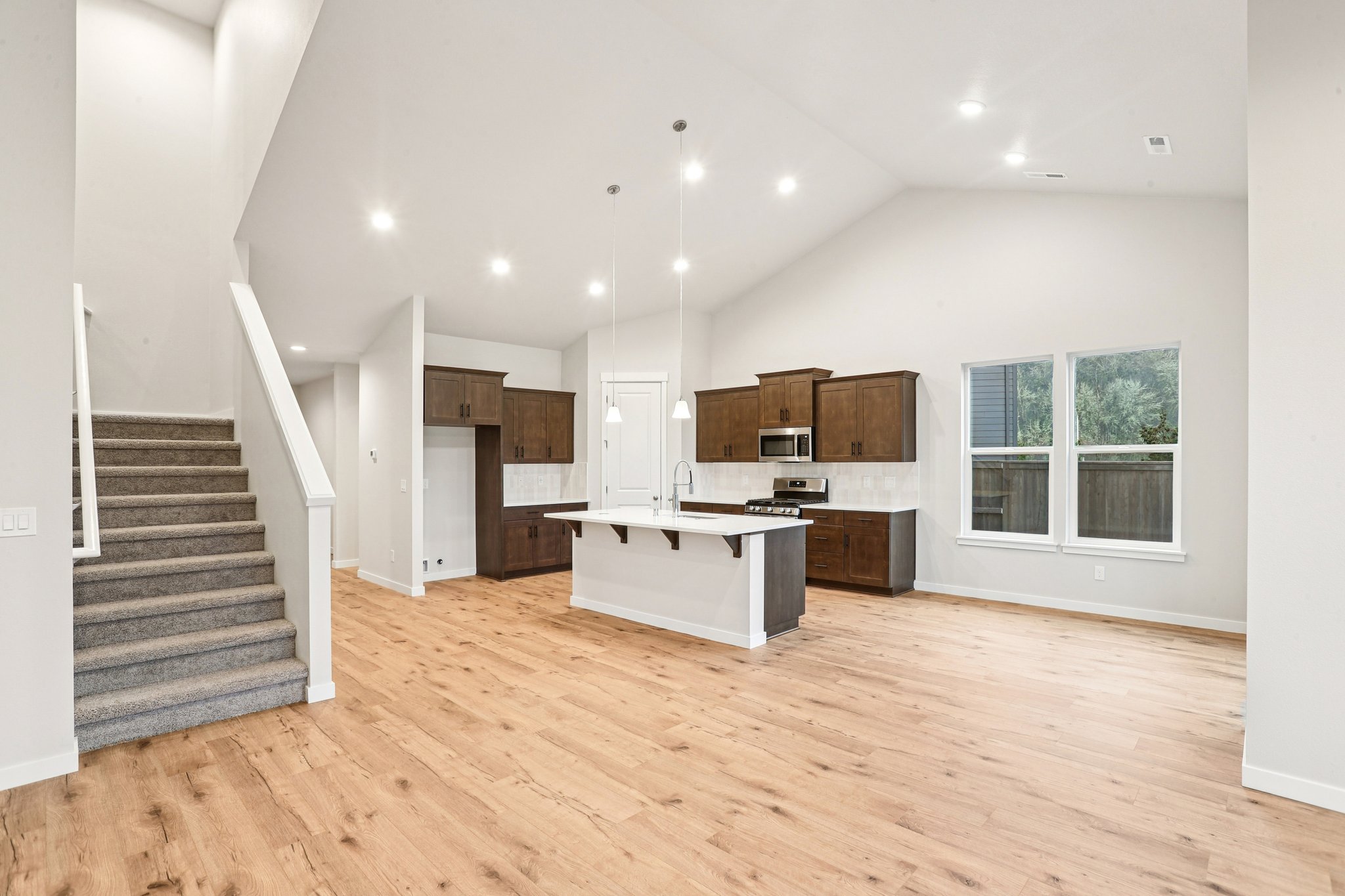 Laundry, double door den and open great room to kitchen with eating bar island round out the first floor, with laminate and carpet flooring throughout the main living spaces. A unique second floor layout with two bedrooms, a full bathroom and option to add a 4th bedroom will be appealing for varying lifestyles and family types, with both separation and togetherness. With LED lighting packages, shaker alder cabinetry, and energy efficient appliances, homeowners will appreciate the details that make this a cleverly designed home, built with extraordinary care and thoughtfulness, brought to you by Holt.