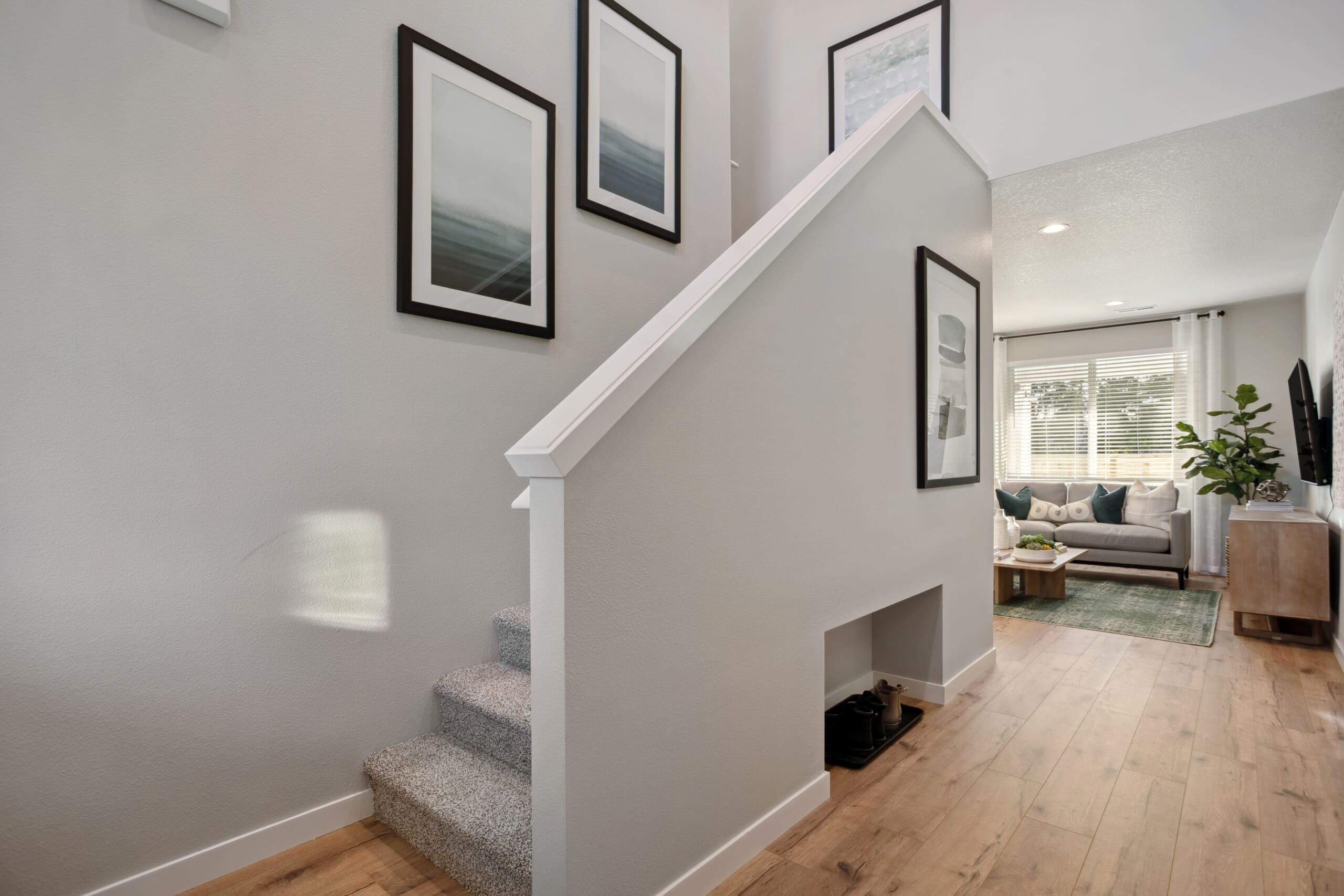 Optional built-ins or floating shelves enhance storage, while a cozy niche under the stairs offers a perfect spot for kids’ toys, a reading nook, or a pet retreat—ensuring every inch of the home is used efficiently.
