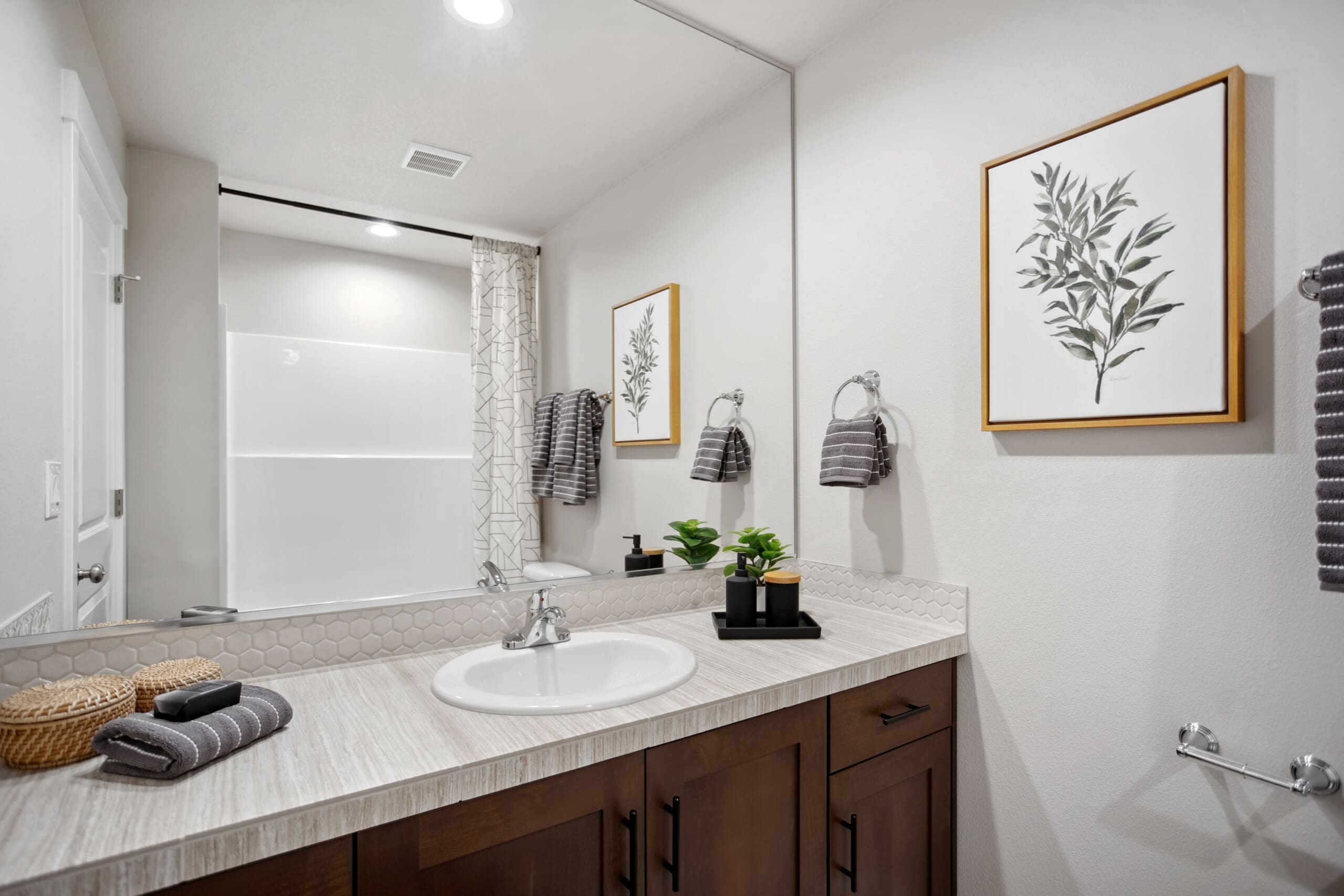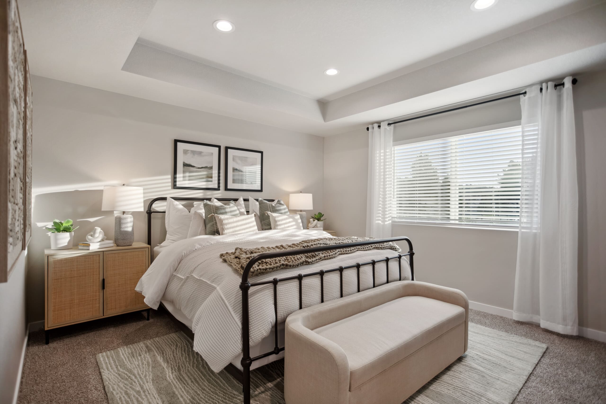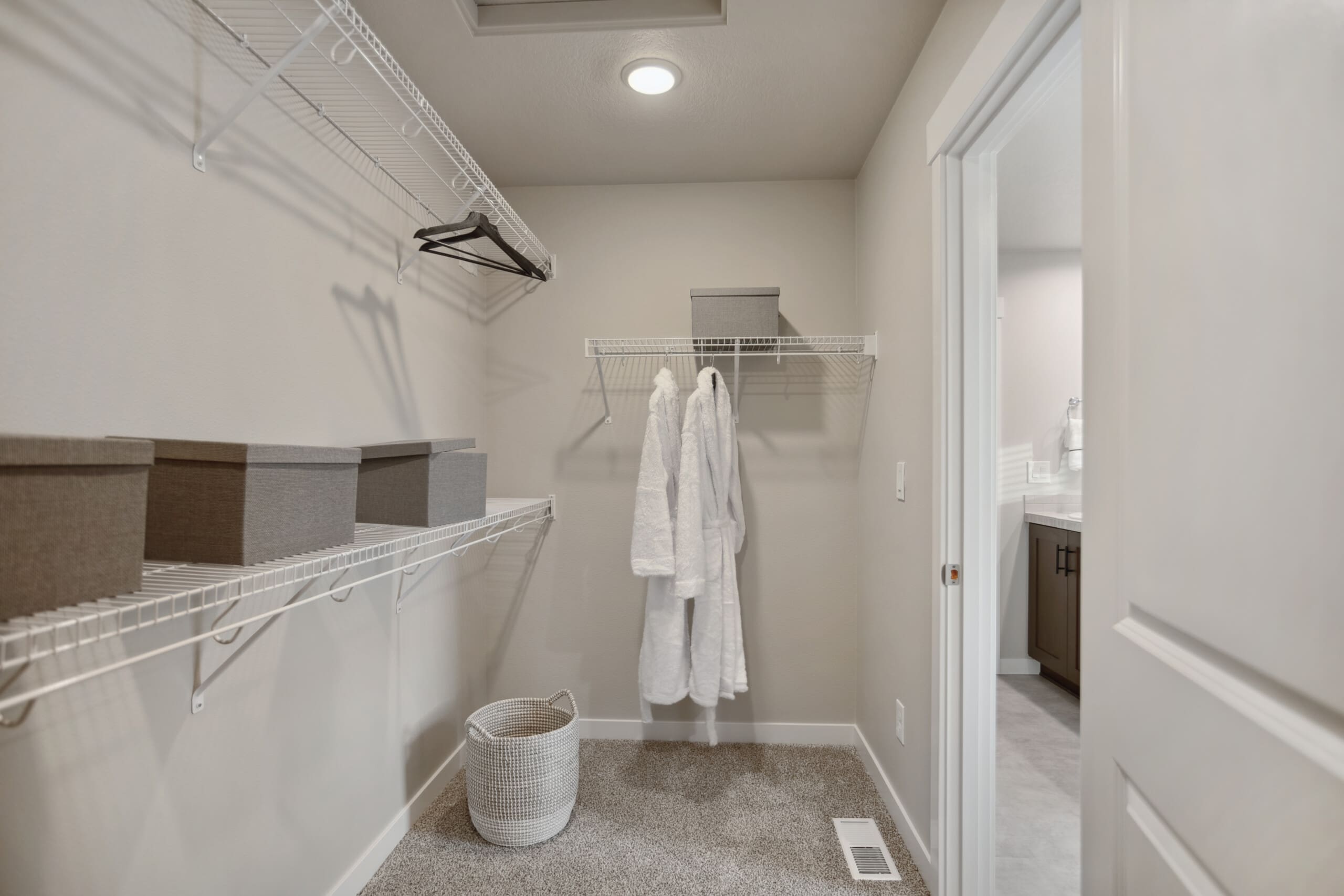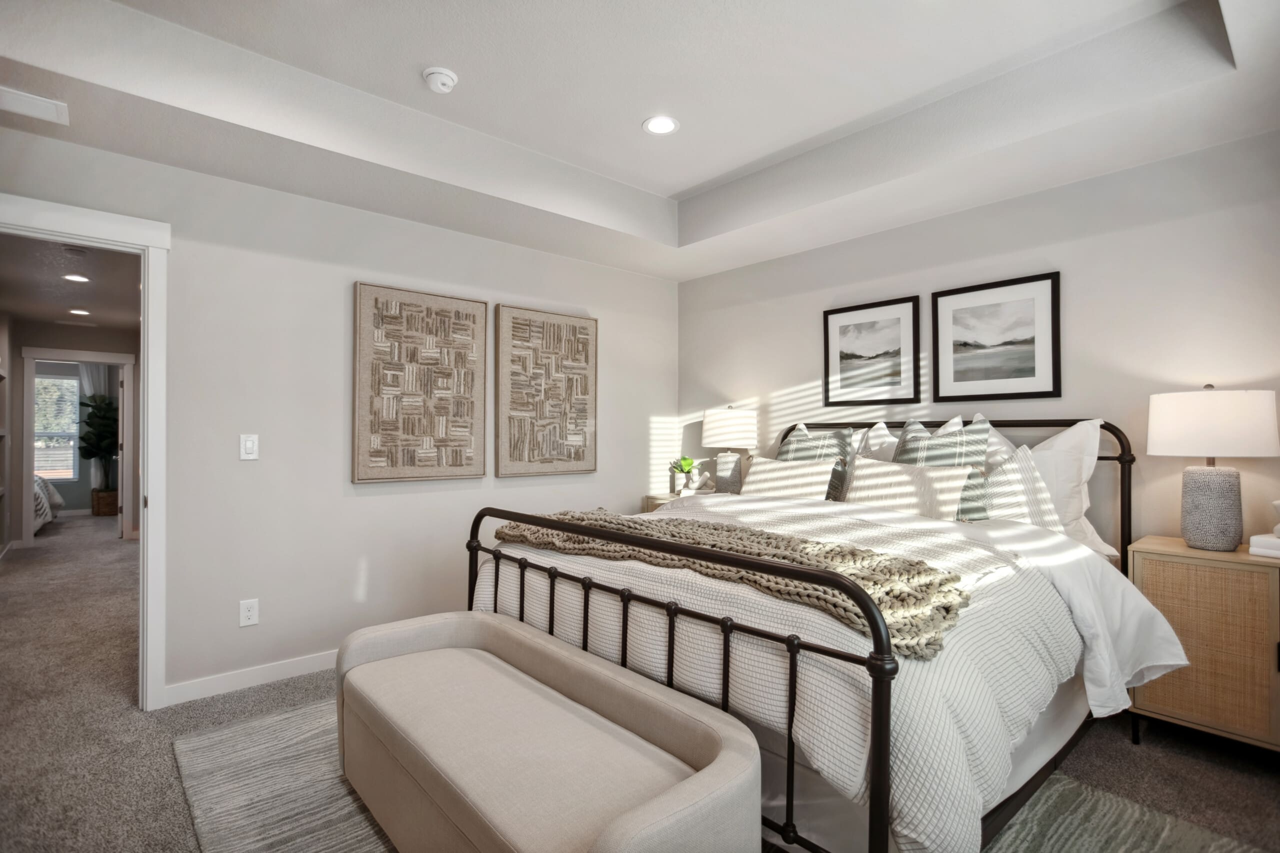 The primary suite is designed for comfort, featuring a beautifully crafted coffered ceiling, spacious layout, and a generous walk-in closet. The en-suite bath offers customization options, including a fully tiled shower with or without a frameless enclosure. Open linen shelving adds convenient storage for towels and toiletries.