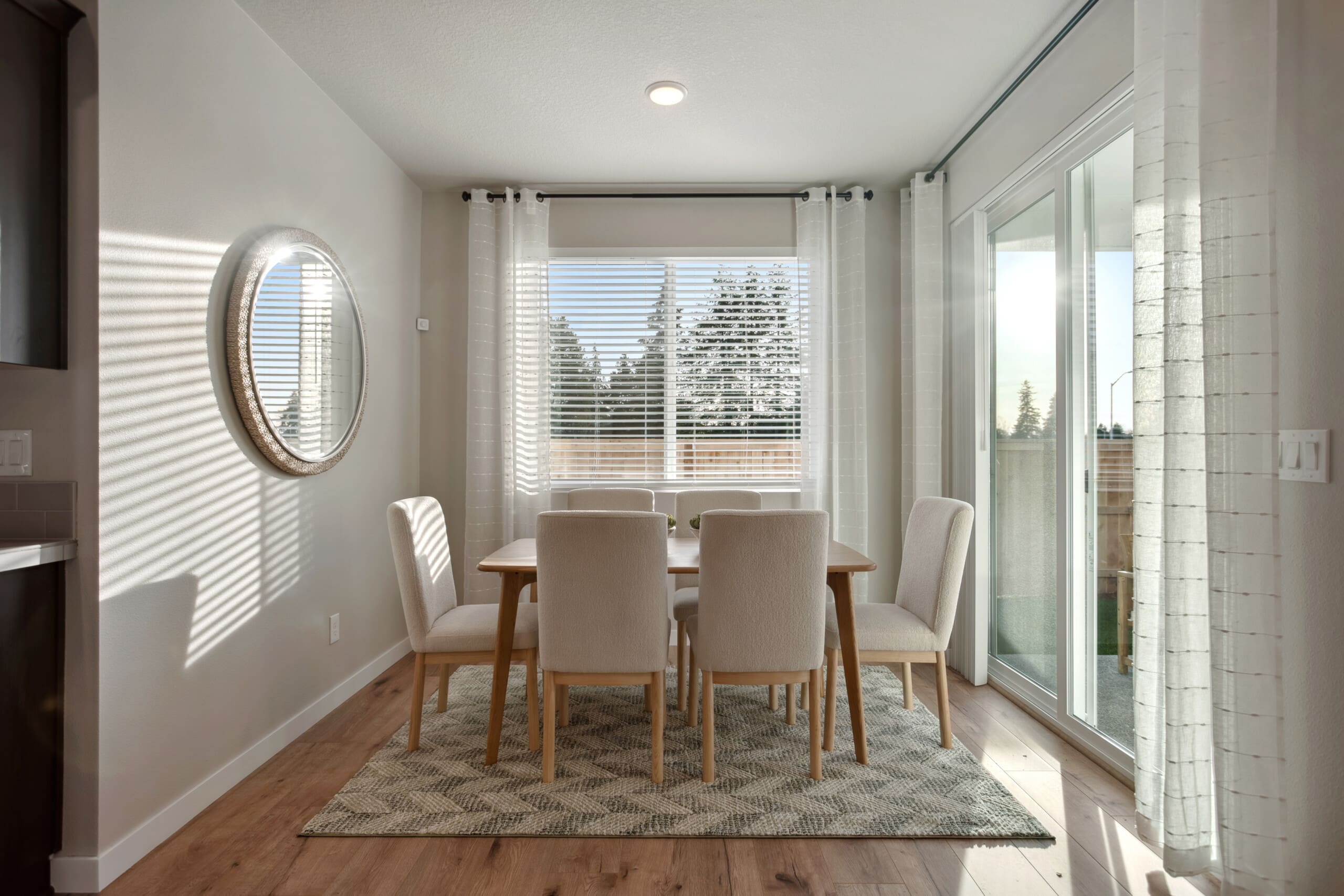 Adjacent to the kitchen, the dining nook offers a welcoming space for everyday meals and special gatherings. Sliding glass doors lead to the covered patio, extending your living space outdoors. Picture warm evenings spent grilling and dining al fresco, making the most of indoor-outdoor living.