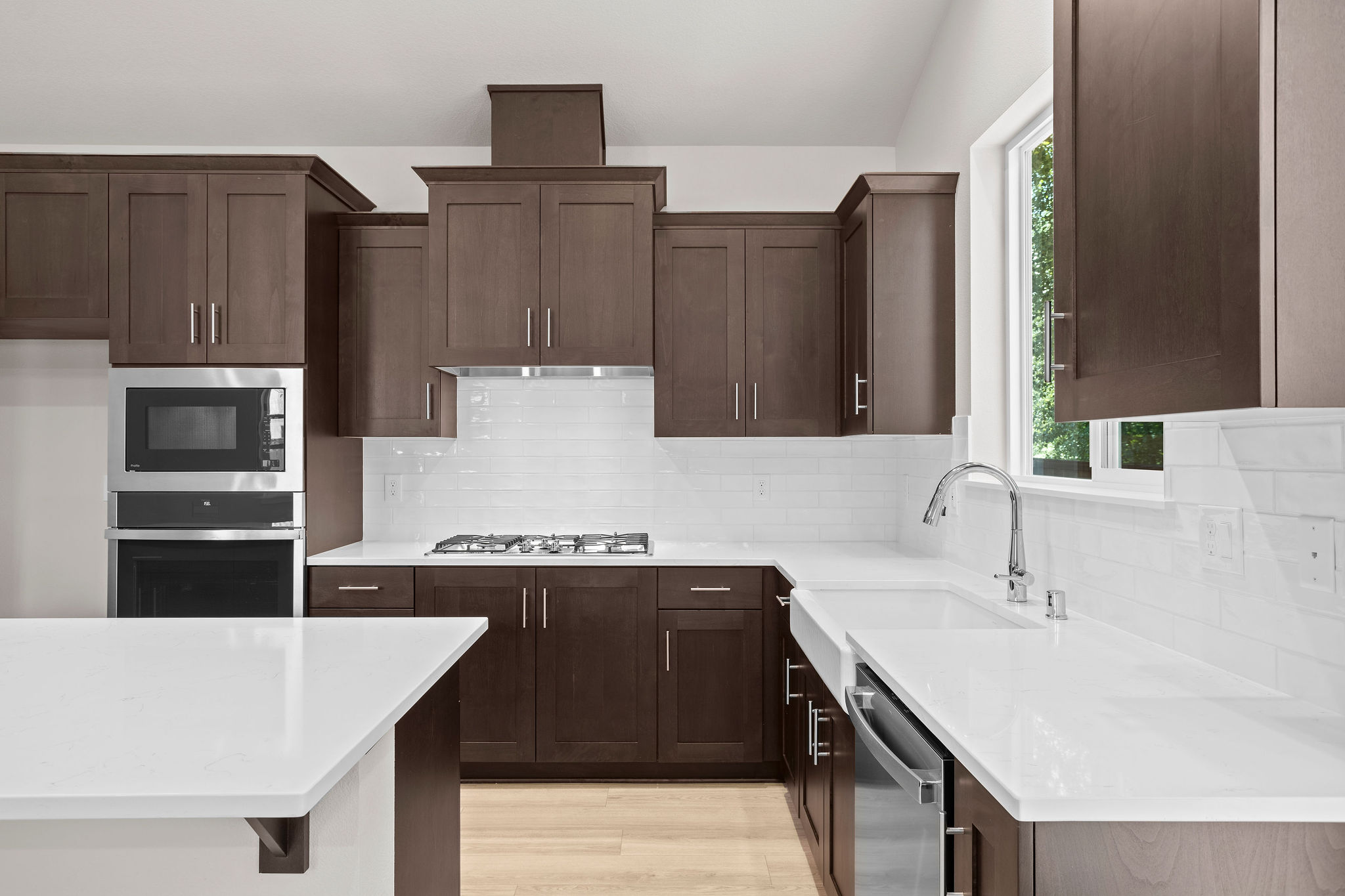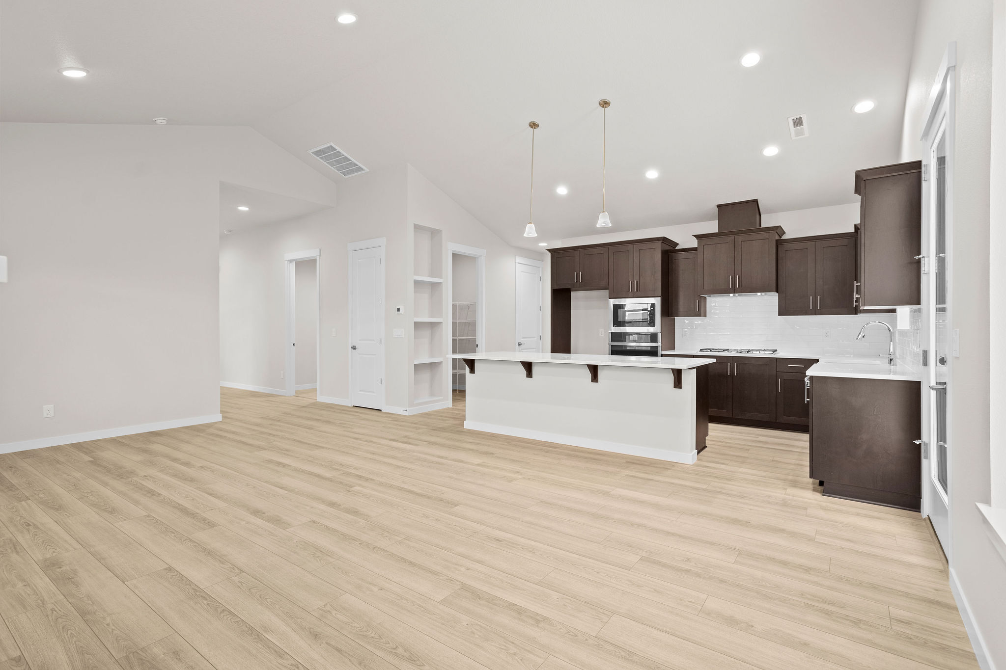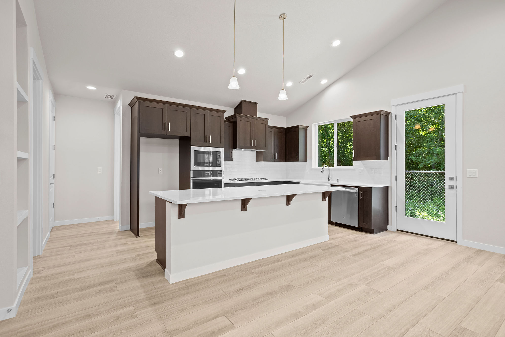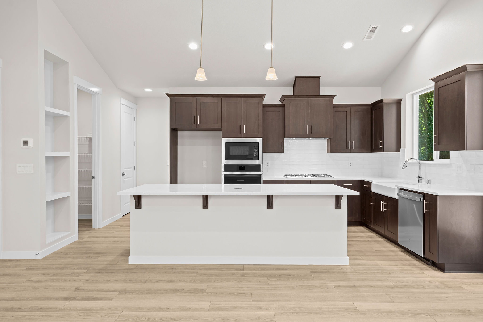 The kitchen features a large island, ideal for meal prep or morning coffee, plus an oversized pantry to keep counters clear. Optional features include a pet feeding station or extra shelving for added convenience. Just off the kitchen, a covered patio extends your living space—perfect for outdoor lounging, grilling, or entertaining year-round.