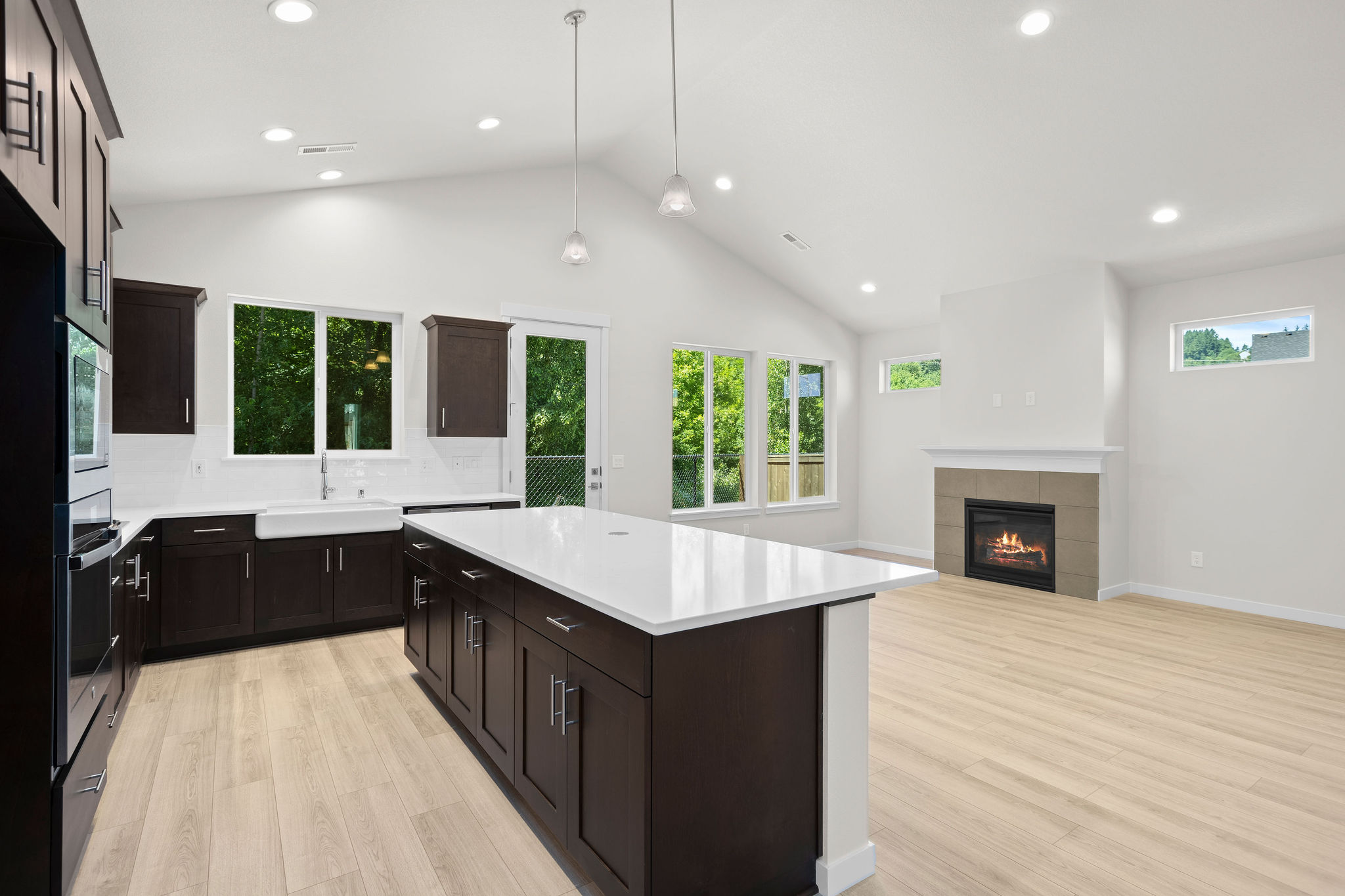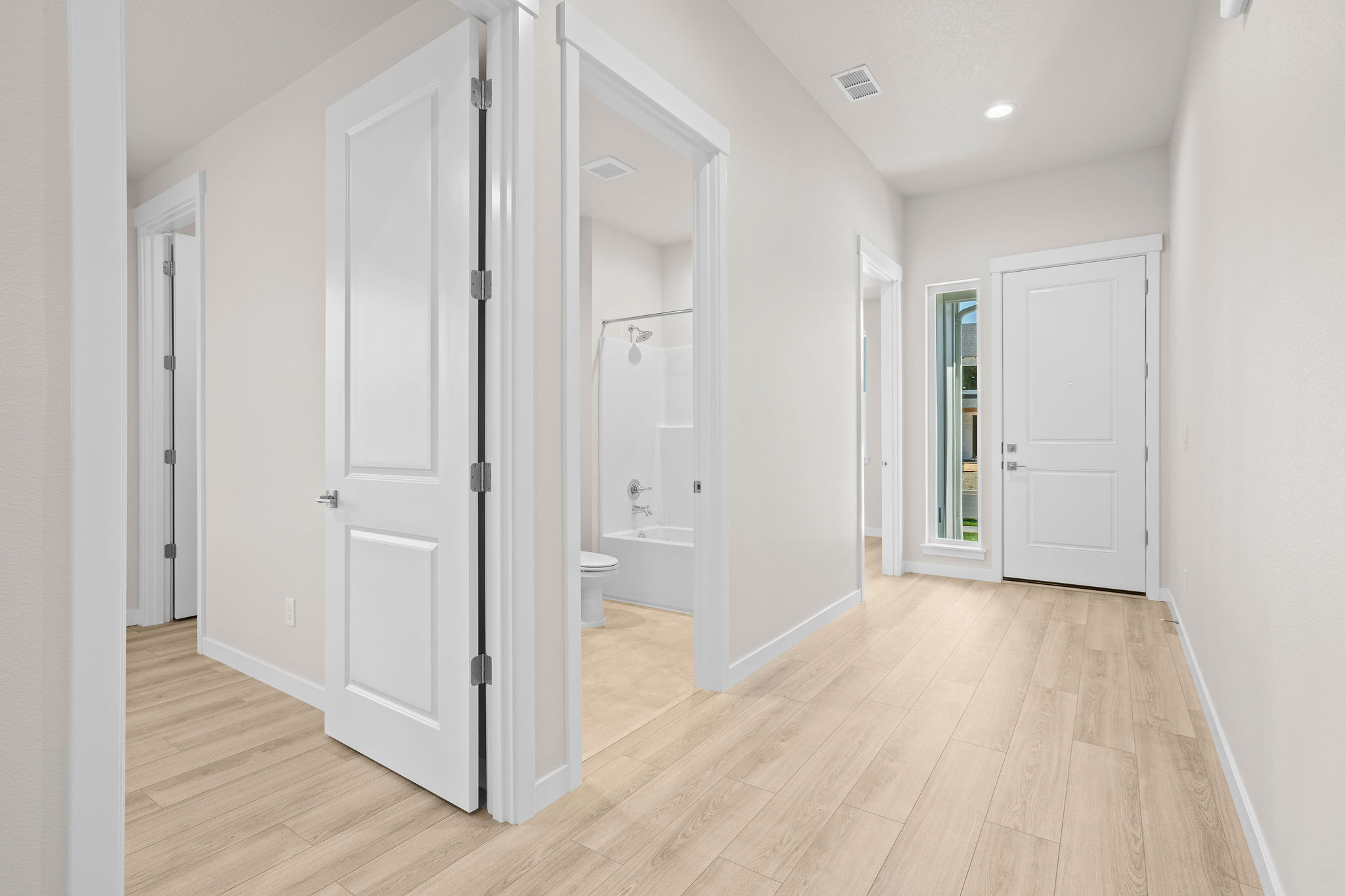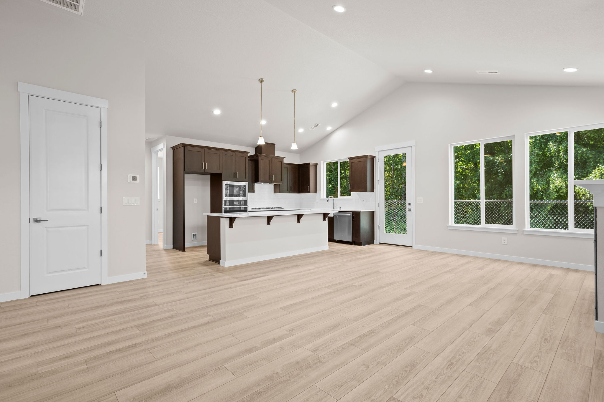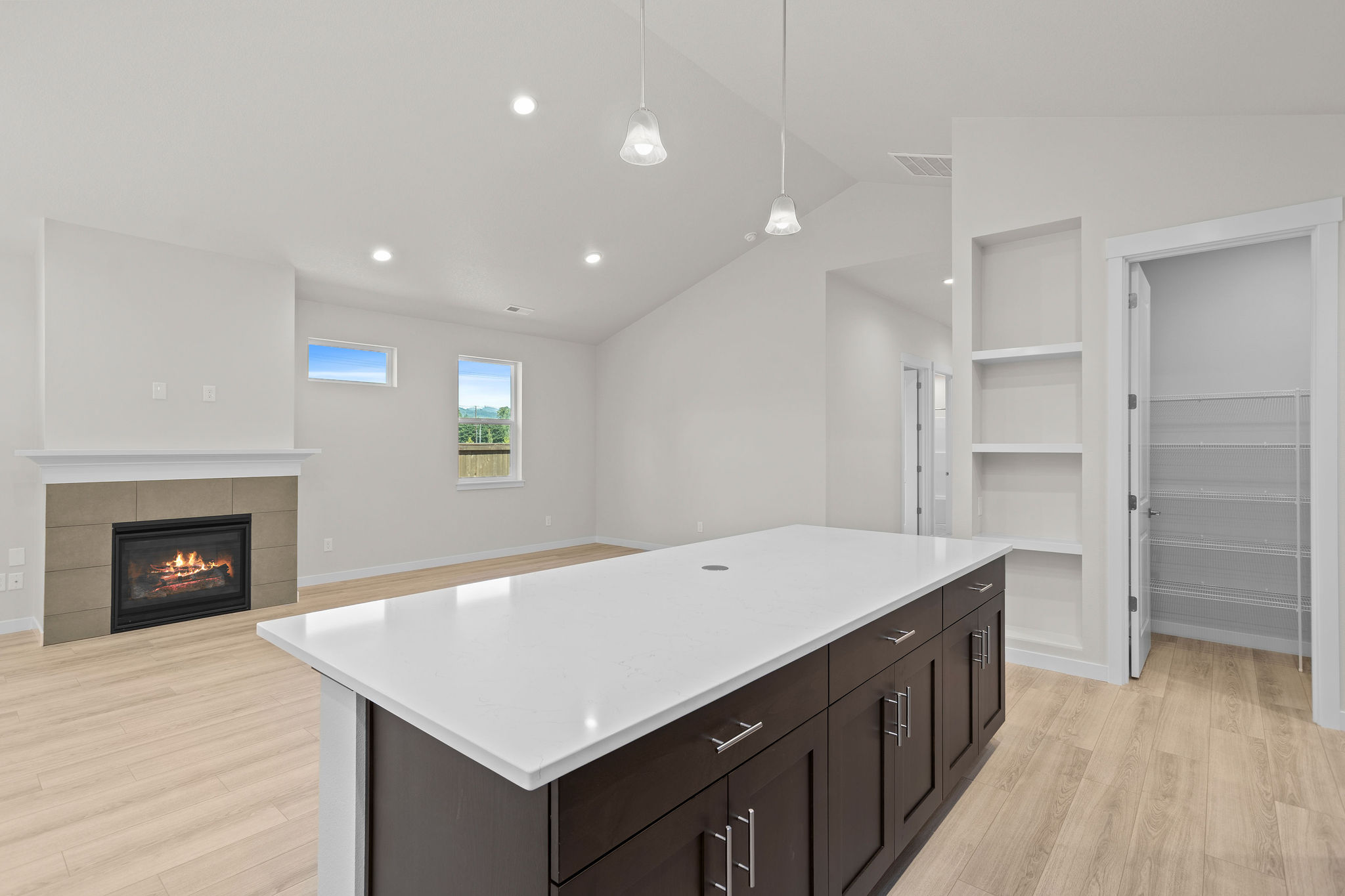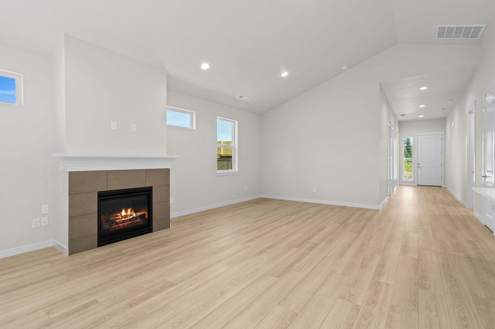 A wide hallway leads into the open-concept family room, kitchen, and dining area, filled with natural light. Personalize your space with optional floating shelves for décor or base cabinets for extra storage. Cozy up by the optional fireplace for a movie night or a relaxing evening with a book.