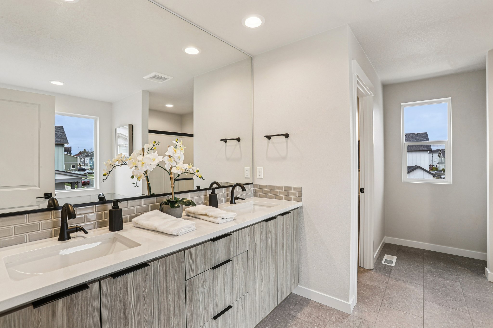 Busy mornings are made a bit easier with a thoughtfully designed secondary bathroom featuring dual sinks and an optional partitioned wall to create additional privacy.