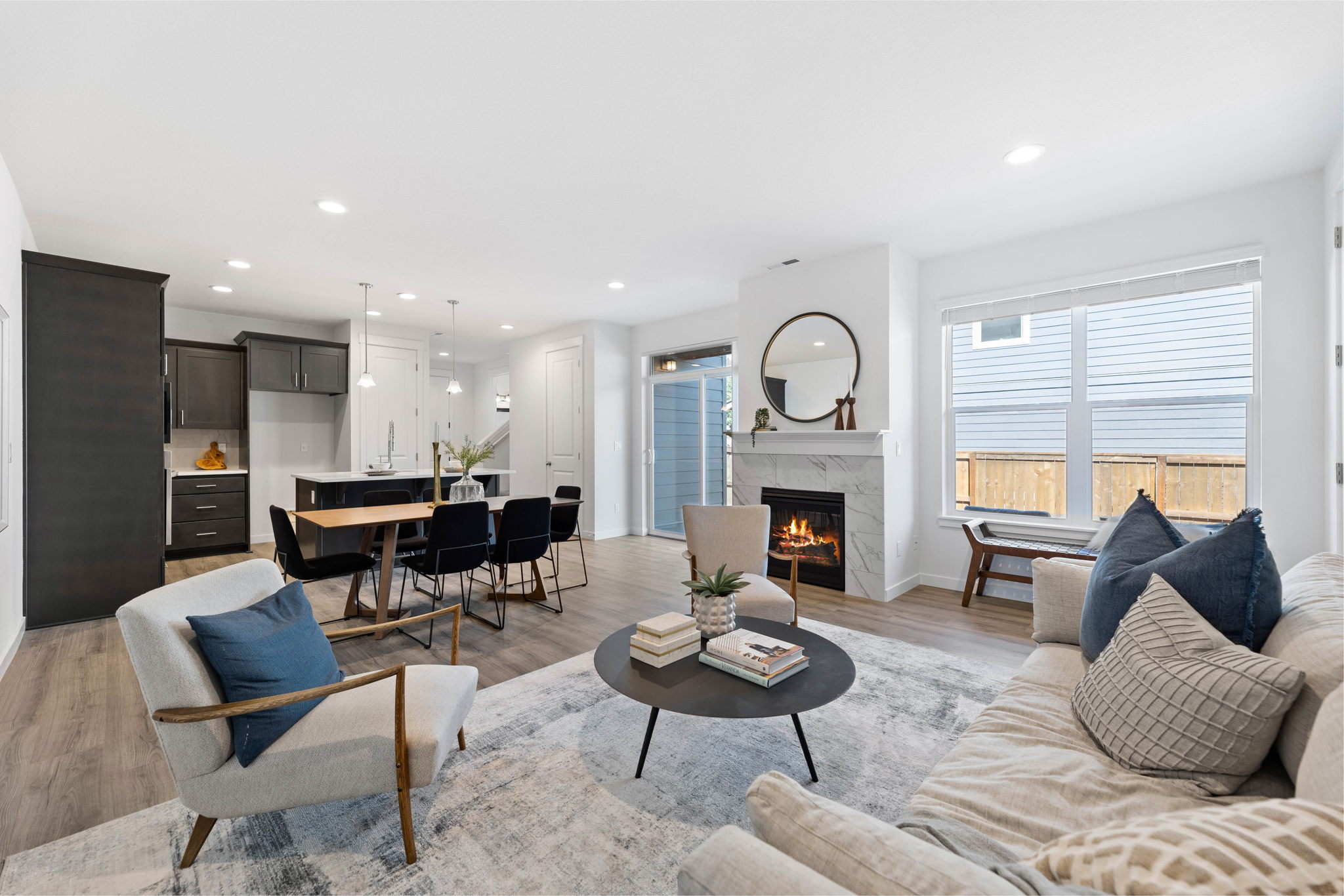 This 1,437 square-foot townhome welcomes you home with a convenient 1-car garage and unique ground-level studio space featuring a private entrance, as well as a functional kitchenette and full bath; a great option for multi-generational living or to rent out as a separate unit. The main level occupies an open-concept living area leading to a covered deck and efficiently designed kitchen with large island and Shaker-style cabinets. An open dining nook and private half-bath add another layer of convenience. On the third floor, you’ll find two generous bedrooms, two full bathrooms, and a space-saving laundry closet to make laundry day a breeze.