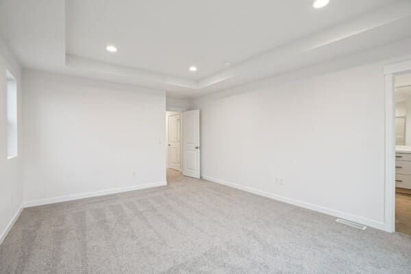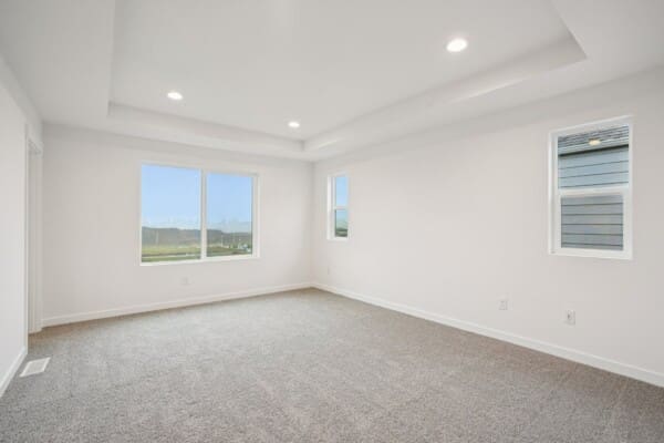 The showstopper on the second floor is the primary suite! Coffered ceilings in the bedroom add visual interests and help enhance the acoustics to create a more mellow, quiet space. Awash in natural light thanks to the many windows, this bedroom is restful and mood enhancing.