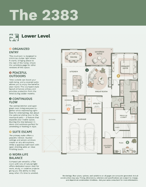 In the 2383 you’ll find a well-planned mudroom helps keep clutter at bay right from the entry. The open-concept great room and kitchen create an effortless flow for entertaining and everyday living, with an option to add a sliding door to the patio, extending your indoor-outdoor space.